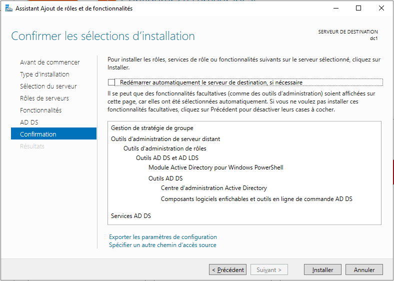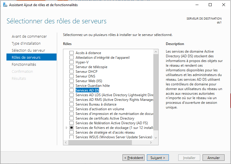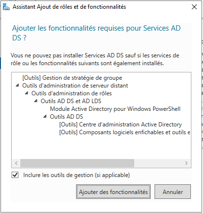 Sélectionner le rôle Services AD DS et ajouter les fonctionnalités requises pour ce rôle.