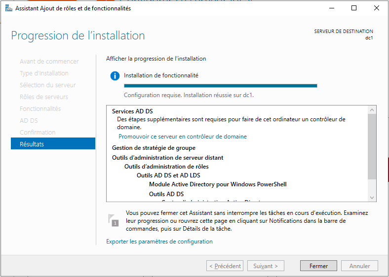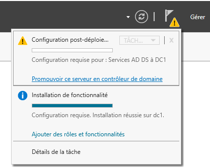 Ce que nous venons est juste l'installation du rôle en tant que tel. Nous allons maintenant procéder à la promotion de ce serveur en tant que Contrôleur de Domaine. Pour ce faire, rendez-vous dans le centre de notification et cliquez sur : Promouvoir ce serveur en tant que contrôleur de domaine