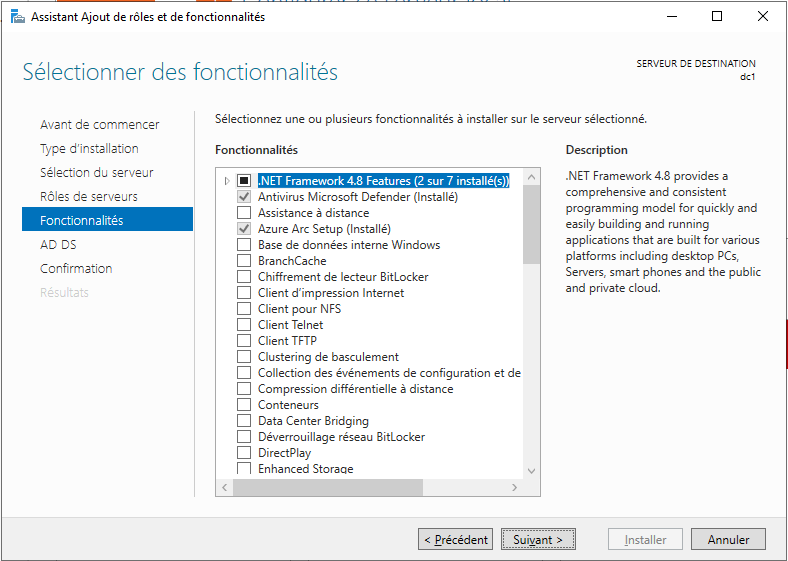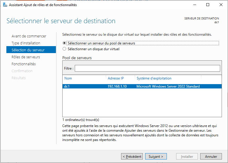 Notre serveur est choisi par défaut (celui sur lequel nous allons installer Active Directory), cela se confirme avec le nom et l'adresse IP que nous avions configuré plus tôt. Cliquez sur Suivant