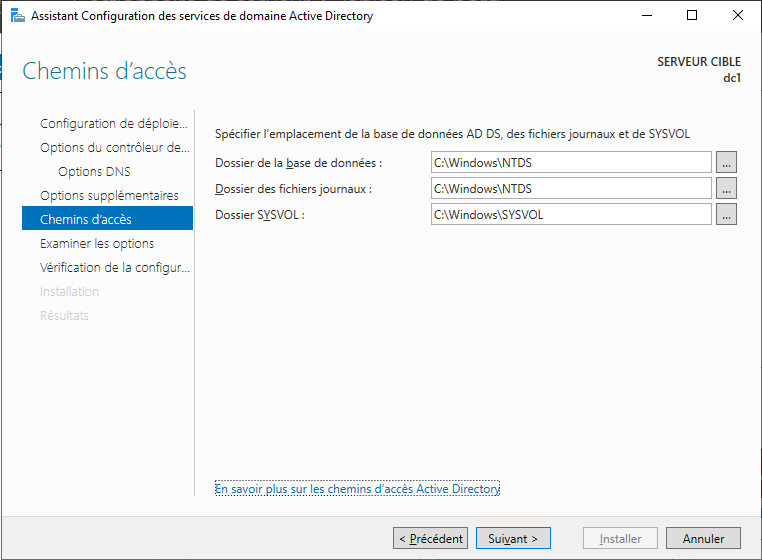 Laissez les répertoires par défaut des fichiers journaux et de SYSVOL et cliquez sur Suivant